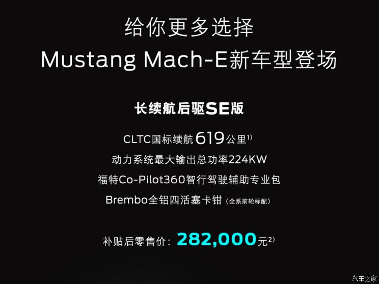[本站 新车上市] 日前,福特宣布Mustang Mach-E新增一款车型――长续航后驱SE版,这…
