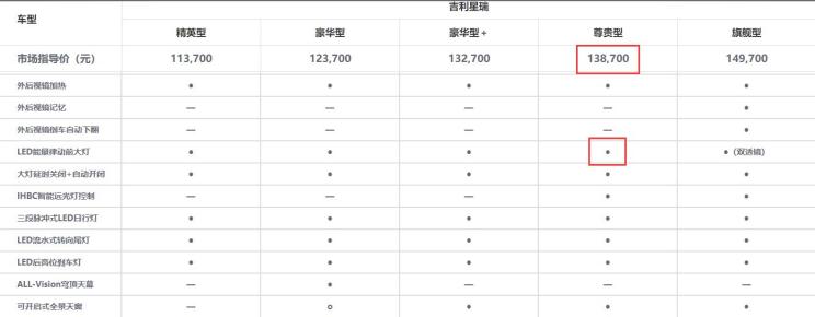 [本站 资讯] 日前,我们从吉利汽车官网获悉,吉利星瑞部分车型配置和价格调整,尊贵型的LED大灯取…