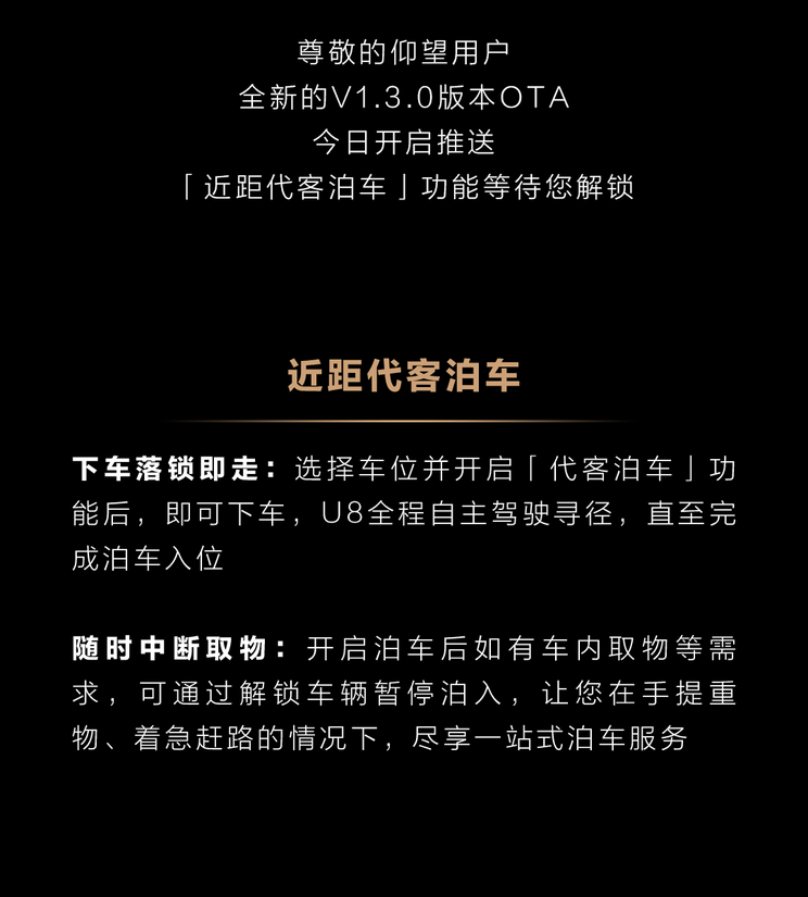 [本站 资讯] 日前我们获悉,仰望目前已开始向用户推送V1.3.0版本OTA升级,本次升…