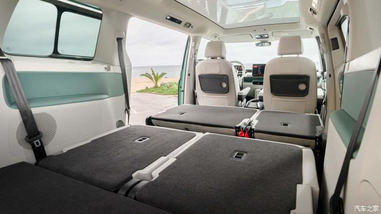 当然,对于大众ID. Buzz LWB来说,重点自然还是在后排,在加长轴距后,新车内部座椅布局可提供5座/6座/7座多种选择。其中5座版车型后备厢空间比标轴车型增加了219L,达到1340L。6座版车型采用2+2+2座椅布局,7座版车型采用2+3+2座椅布局。第二排座椅可前后移动200mm,并配备座椅加热、后排小桌板等配置,同时该车还配备1.5平方米的玻璃车顶,其可以实现变色控制,从而调整太阳光照进车内的强度。