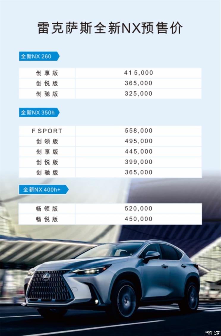 [本站 资讯]近日,我们从相关渠道获得了全新雷克萨斯的预售价,该车预售价区间为32.5-55.8万元…