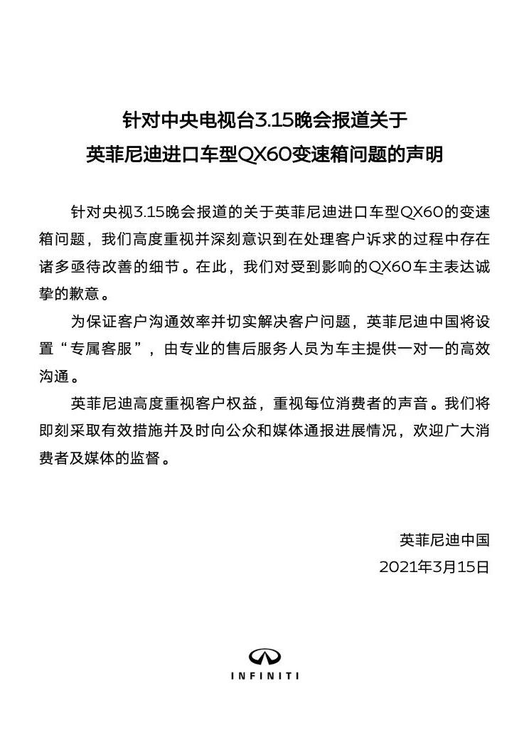 [本站 资讯]在2021年3・15晚会(国际消费者权益日)上,央视对英菲尼迪QX60出现异响、高速失…
